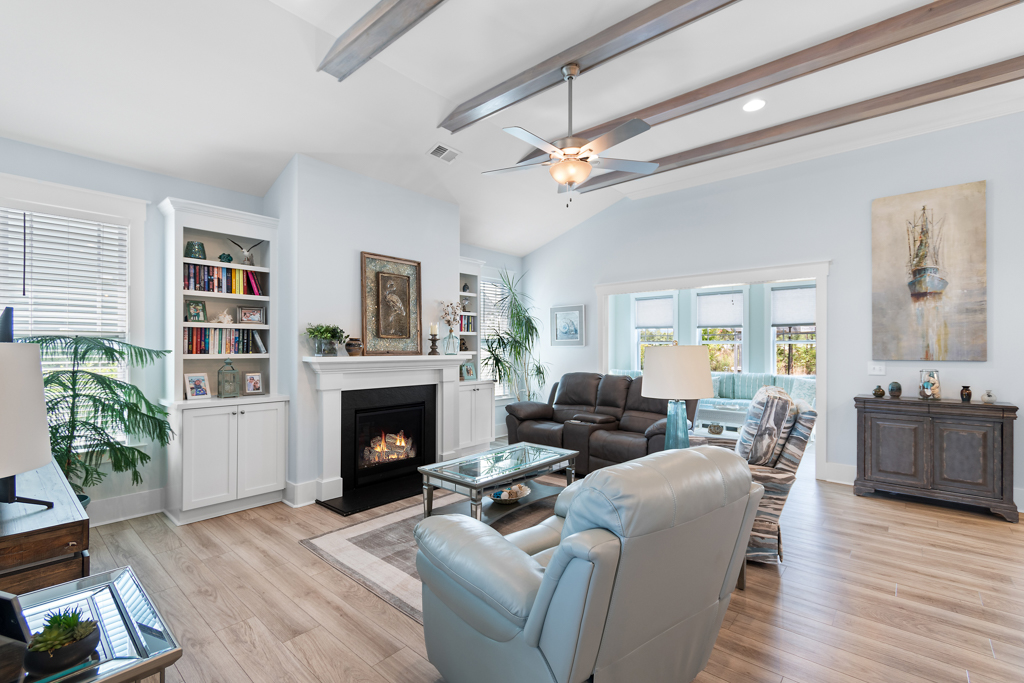 If you have been waiting for a better than new, stunning home with a yard large enough to accommodate a pool, then you are in luck! Welcome to The Retreat, a vibrant and social community just minutes from the pristine sands of Ocean Isle Beach. Conveniently located to shopping, dining, beach, golf, healthcare and other recreation opportunities, this house is an absolute gem. These conscientious owners have taken excellent care of this home and done some nice extras, including a sunroom, custom blinds, paver extensions to the driveway, and an oversized paver patio with pergola. The high, beamed ceilings add to the open and airy feel of this home. Wainscoting adorns the foyer and dining area and craftsman-style trim detail gives this home an elegant, coastal feel. The living room boasts LVP flooring and a fireplace surrounded by built-ins. With an efficient, split floor plan, both guests and owners can enjoy their privacy while still sharing common area. The living room, kitchen and dining area are all adjacent to each other, offering very comfortable space for lounging or entertaining. The spacious kitchen offers two-toned cabinetry, an island with granite counters, tile backsplash, wall oven, electric cooktop, vent hood and pantry.